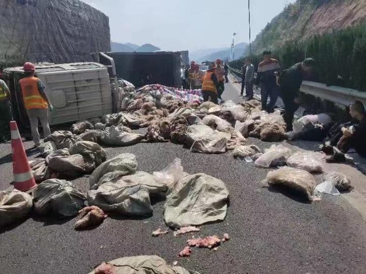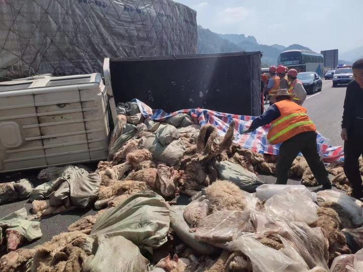 赶到现场的高速交警发现,这辆装满羊皮的货车侧翻在超车道和主车道之间,车辆已经严重影响了后方车辆通行。