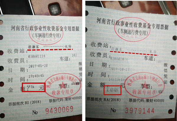 “我的同一辆车、走的是同一条线路,但这次多了5块钱。”这让刘先生非常不解。根据刘先生向记者提供数张济源东——长垣的高速收费票据,记者发现,10月17日济源东——长垣确实显示收费100元,2019年1月、5月的三张收费票据显示收费均为95元。