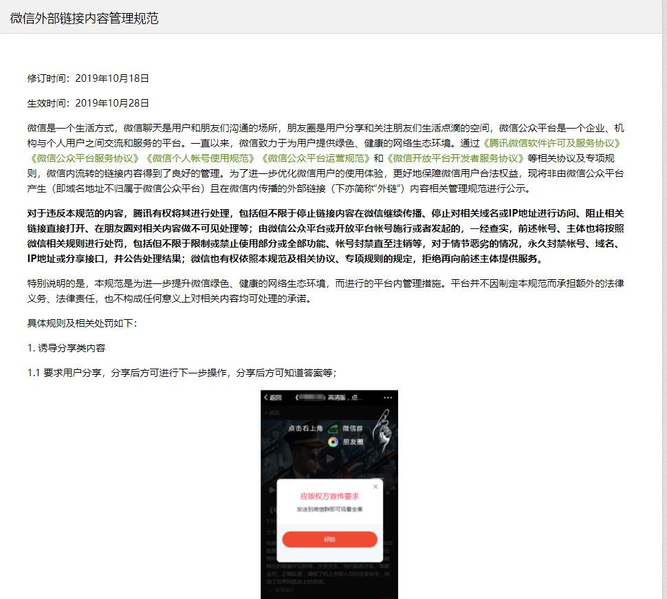 根据微信发布的《微信外部链接内容管理标准》,微信外链“不可进行好友助力、加速、砍价、任务收集等违规活动”、“不可以违规拼团等”。