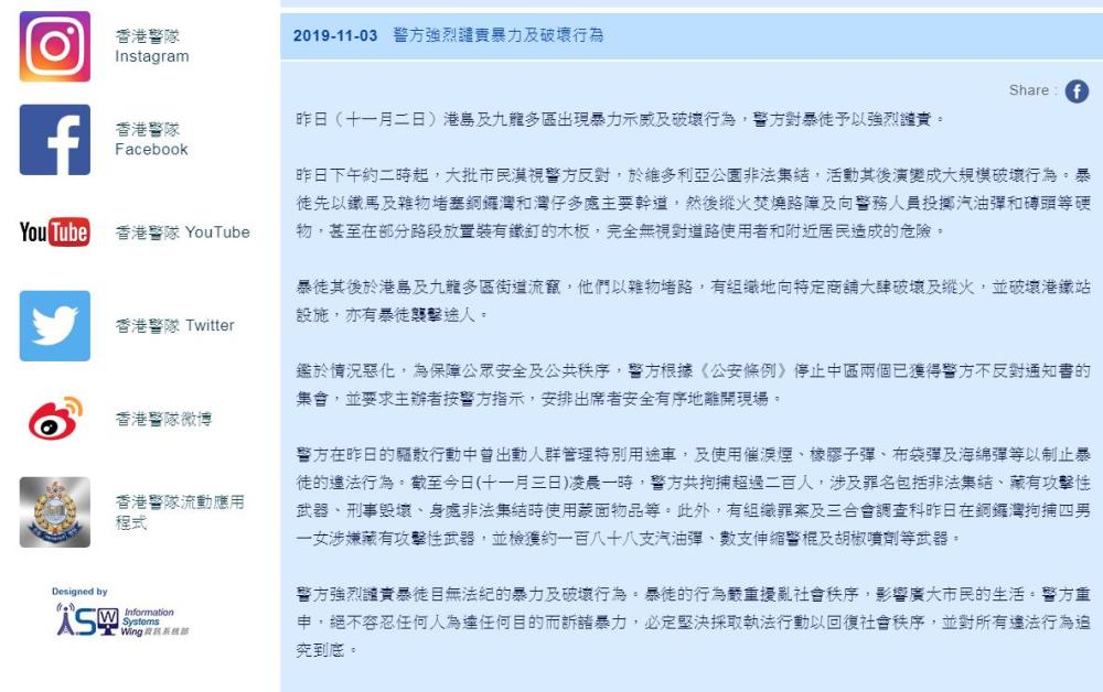 香港警方于11日3日凌晨2时发表声明提到,2日下午约14时起,有人漠视警方反对,在维多利亚公园非法集结,其后演变成大规模破坏行为。