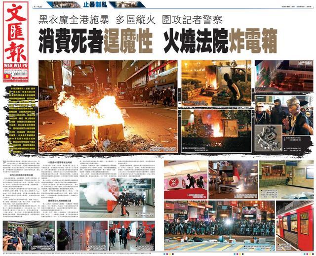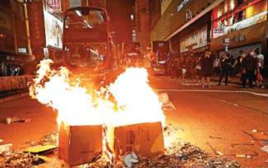 大批黑衣暴徒先是破坏科大校长住所、捣破校园食堂银行,晚上更在各区堵路、向警员以及港铁站掷汽油弹、放火烧电箱引发爆炸、火烧荃湾裁判法院。
