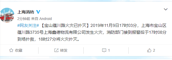 【新民晚报·新民网】2019年11月9日17时03分,上海市宝山区蕴川路3735号上海鑫德物流有限公司发生火灾,消防部门接到报警后于17时08分到场扑救,18时27分将火灾扑灭。