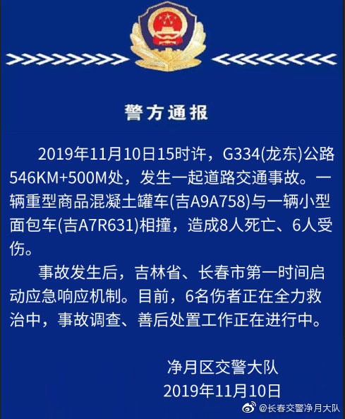2019年11月10日15时许,G334(龙东)公路546KM+500M处,发生一起道路交通事故。一辆重型商品混凝土罐车(吉A9A758)与一辆小型面包车(吉A7R631)相撞,造成8人死亡、6人受伤。