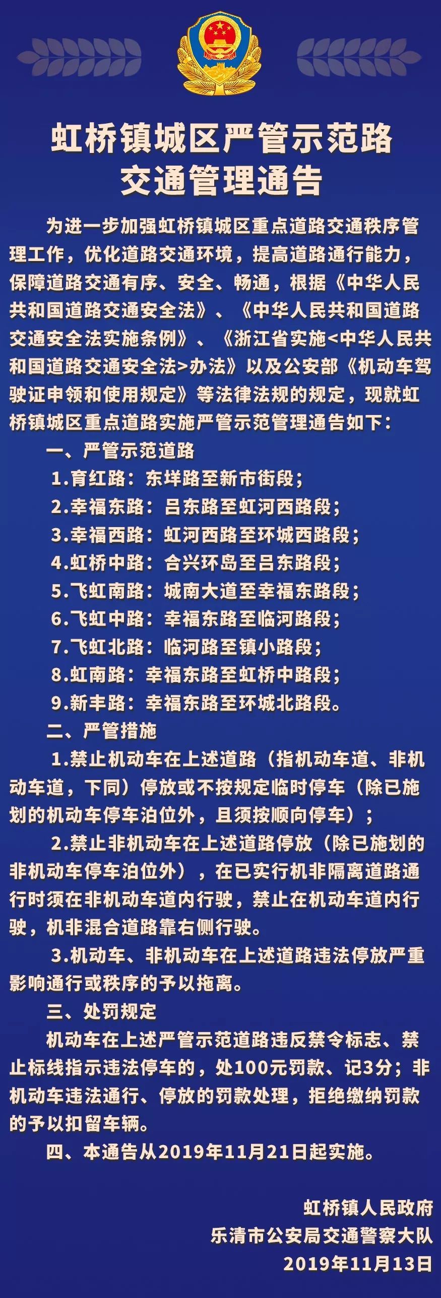 虹桥镇城区严管示范路交通管理通告