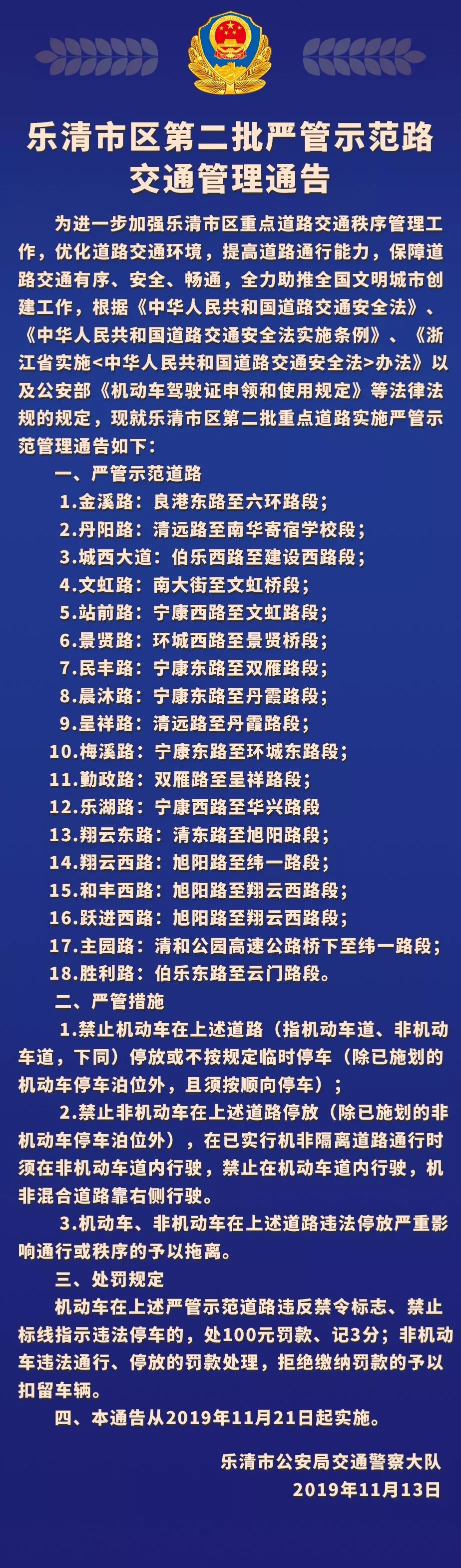 乐清市区第二批严管示范路交通管理通告
