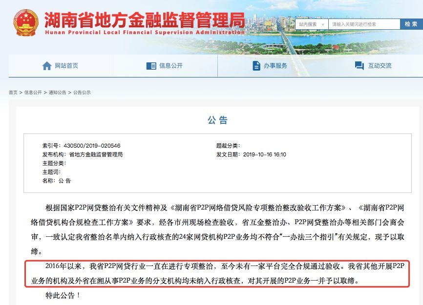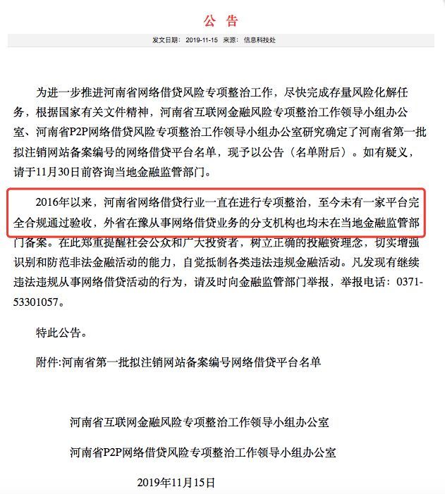 11月15日,河南省地方金融局发布《河南省网络借贷风险专项整治公告》称,自2016年对该省网络借贷行业专项整治以来,至今未有一家平台完全合规通过验收,外省在分支机构也均未在当地金融监管部门备案。