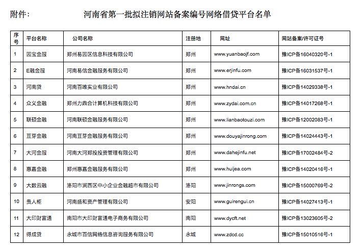 为进一步推进河南省网络借贷风险专项整治工作,尽快完成存量风险化解任务,河南省研究确定了该省第一批拟注销网站备案编号的网络借贷平台名单,包括园宝金服、E融金服、河南贷等12家P2P。
