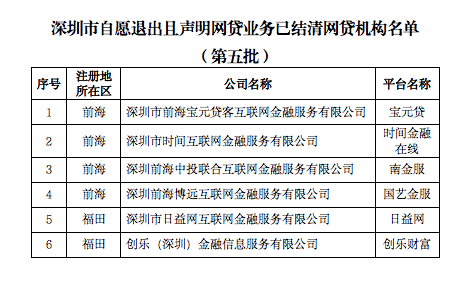 同日,深圳市地方金融局继续发布了该市第五批6家自愿退出且声明网贷业务已结清的网络借贷信息中介机构名单。