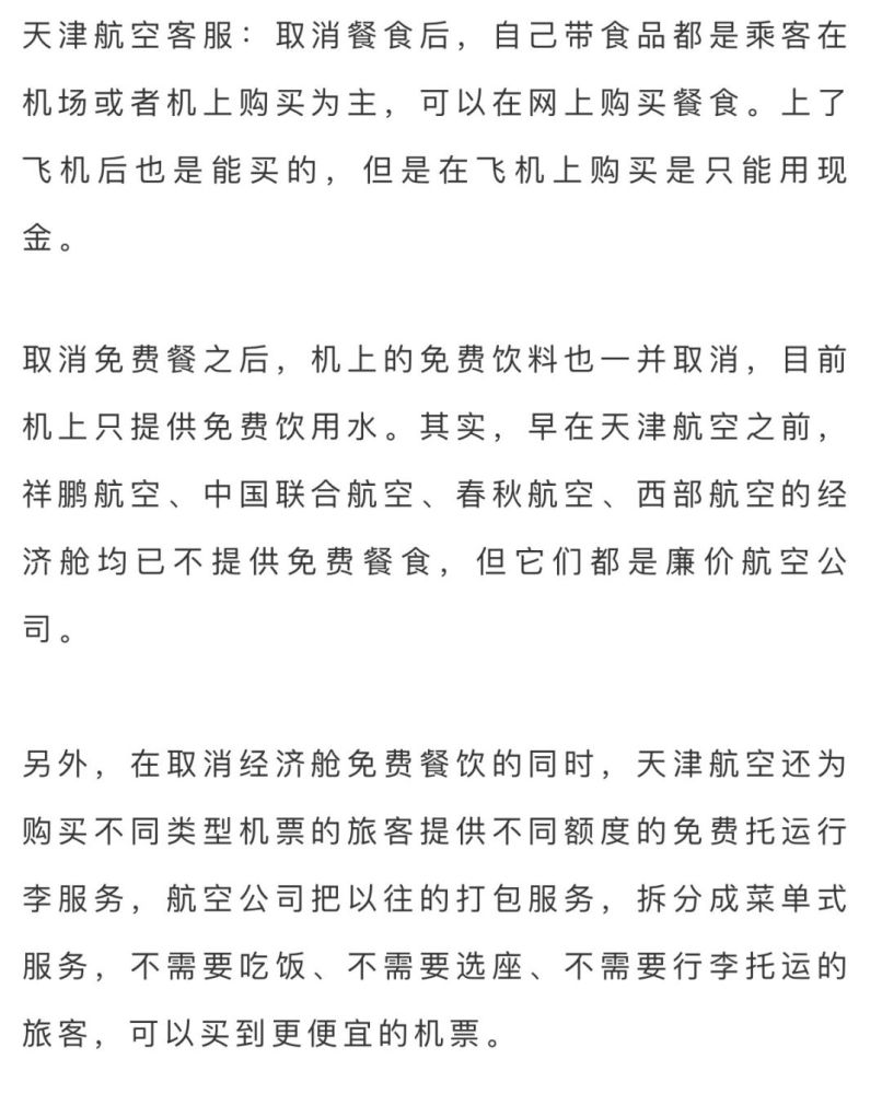 天津航空公司在去年10月份,不仅取消了经济舱免费餐饮,而且针对不同类型机票的旅客,提供不同额度的免费托运行李服务。