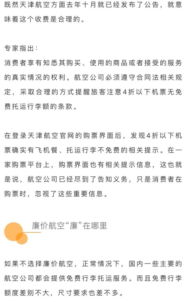 天津航空工作人员介绍说,天津航空从2018年10月28日起已经变成低成本航空了,4折以下机票没有免费托运行李额。