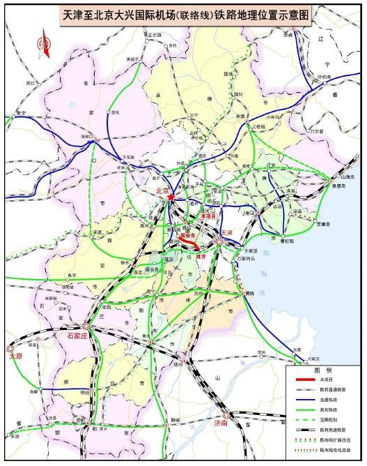 天津西至胜芳利用津保铁路,固安东至新机场利用京雄城际。