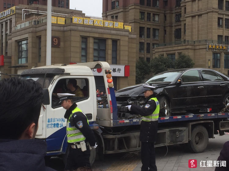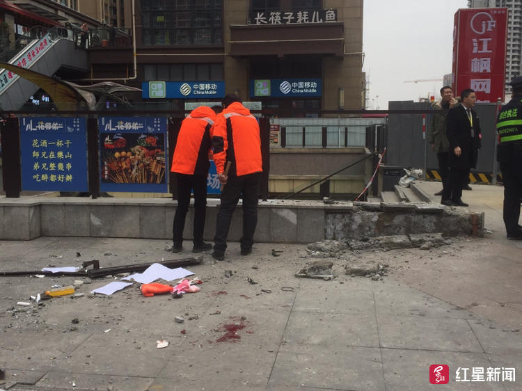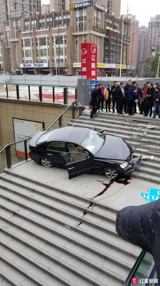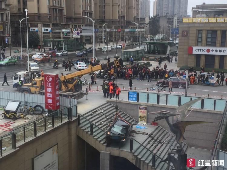 下午3时许,红星新闻记者赶到事发现场。现场拉起了警戒线,不少路过市民在线外围观。白色轿车正被拖离,丰田轿车仍在下沉广场的阶梯上,一辆吊车正准备起吊车辆。据了解,现场有一名男子受伤送医。