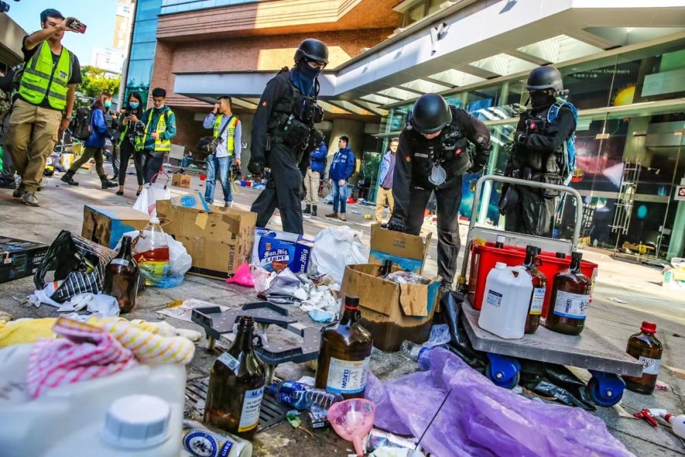 香港警方11月28日首次进入理大搜查取证,全天共检获3801枚汽油弹并发现588瓶化学物品、200支箭等,其杀伤力不可谓不大。警方同时表示,有信心11月29日将校园交还给理大校方。