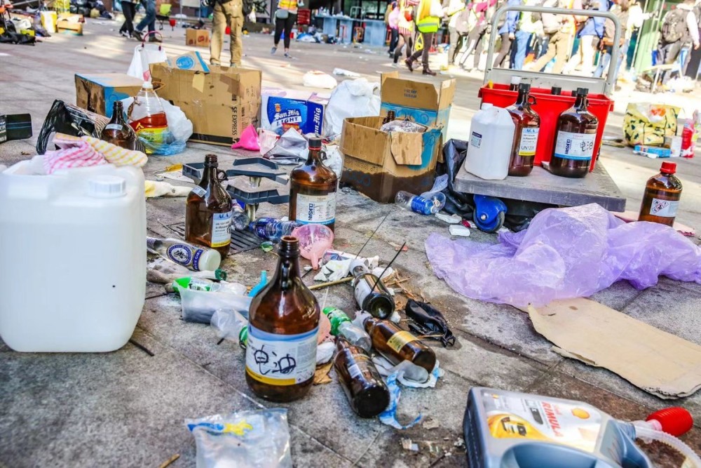 尽管暴力分子已几乎全部离开香港理工大学,但他们遗留的攻击性物资却十分危险。