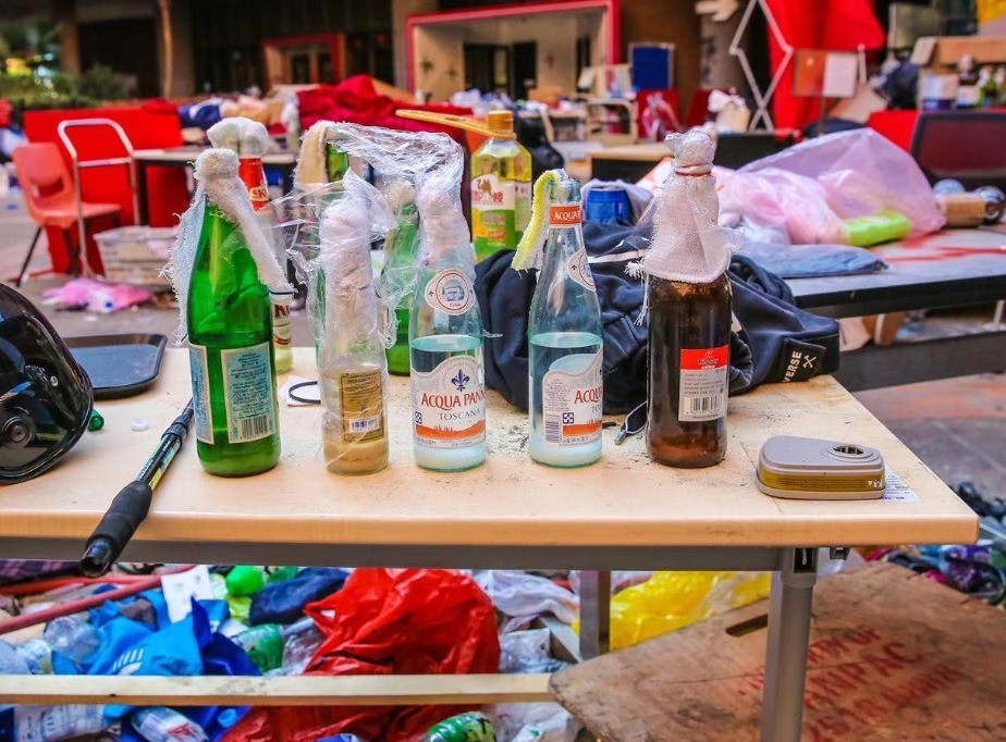 理大校内汽油弹数量惊人,还有不少制作汽油弹的原料电油。