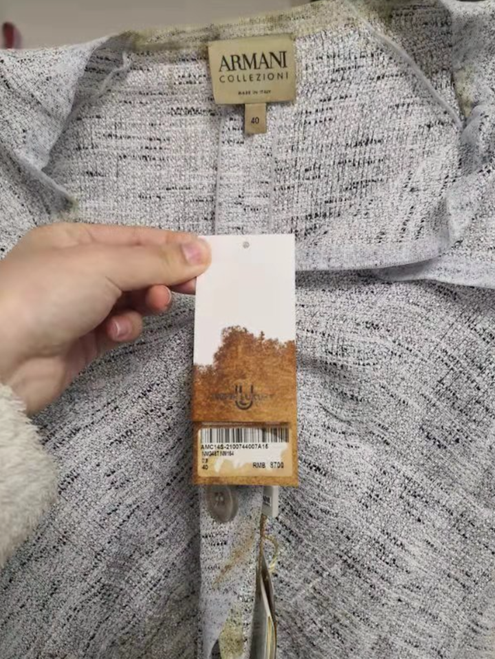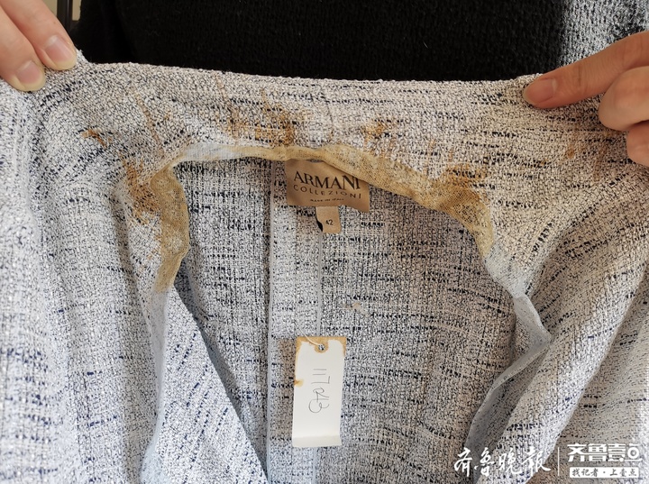 11月28日,在青岛西海岸新区灵山卫街道干河子路某小区内,记者看到被污染的衣服多为阿玛尼、迪奥等知名品牌。虽然接收到快递已经过去近一个月,但衣服上的污渍依旧非常明显。经清点,被污染的衣服共计14件。