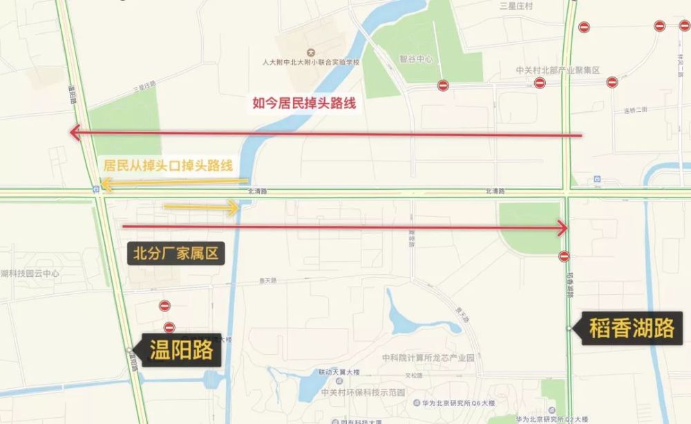 据北分厂家属区居民描述,11月2号晚上,掉头路口开始加装隔离墩。第二天一早,北清路上的两个掉头口就已经全都被封死了。如今,北分厂家属区的居民向西走,要先顺着北清路向东行驶将近2公里,到稻香湖路十字路口掉头,然后再向西行驶将近2公里,到温阳路路口。然而,北分厂家属区和温阳路路口的直线距离只有200米不到。