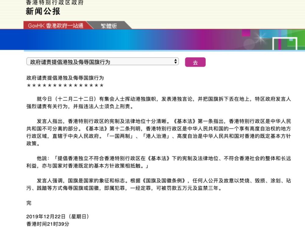 就今日(十二月二十二日)有集会人士挥动港独旗帜,发表港独言论,并把国旗拆下丢在地上,特区政府发言人强烈谴责有关行为,并指违法人士须负上刑责。