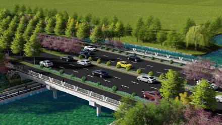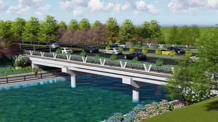 杭州建设该工程位于钱塘新区海达北路接壤乔司区块,横跨新建河,采用16+20+16米三跨大铰缝预应力钢筋砼空心板,桥宽50米,桥梁横断面布置与河道南侧已建道路一致,下部结构采用桩柱式桥墩,重力式桥台,钻孔灌注桩基础,桥面铺装采用中粒式沥青,人行道铺装采用花岗岩铺装,人行道侧栏杆采用石质栏杆,机动车道侧采用防撞护栏。预计2020年8月底完工。