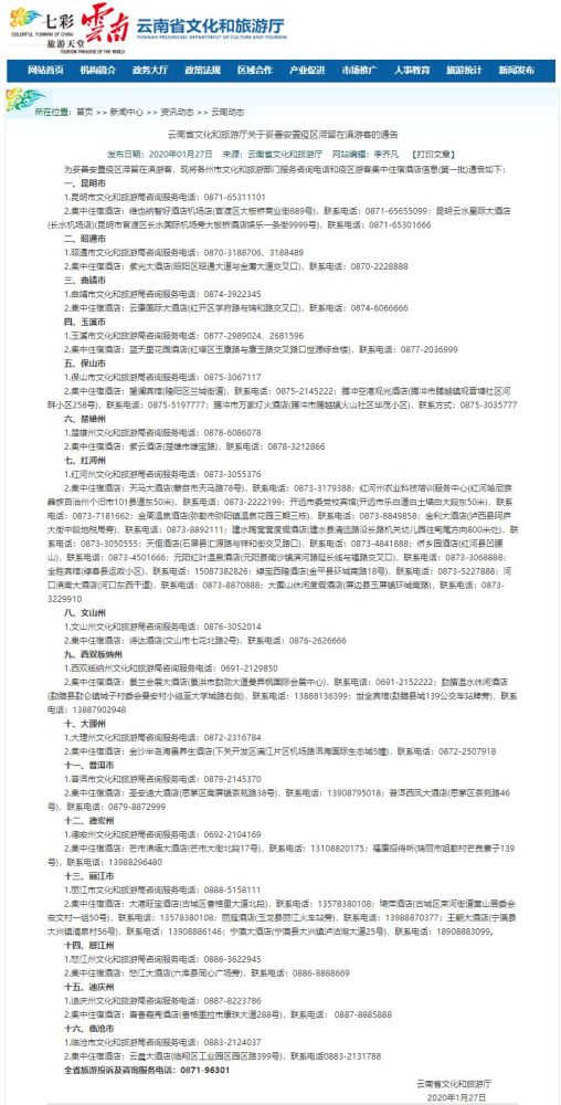 据悉,目前云南省各市州、广东省湛江市等地已对来自湖北的旅客实行定点酒店统一安置。此外,广西桂林也为湖北籍游客开放了定点宾馆。