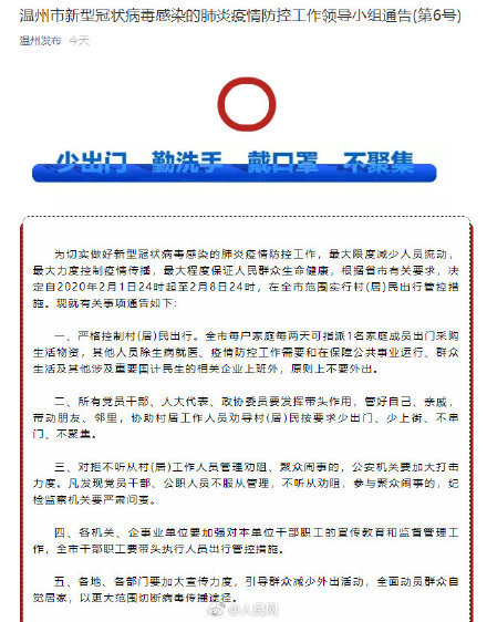【温州实施出行管控:每家每两天可指派1人出门采购】浙江温州决定自2020年2月1日24时起至2月8日24时,在全市范围实行村(居)民出行管控措施。全市每户家庭每两天可指派1名家庭成员出门采购生活物资,其他人员除生病就医、疫情防控工作需要和在保障公共事业运行、群众生活及其他涉及重要国计民生的相关企业上班外,原则上不要外出。(温州发布)