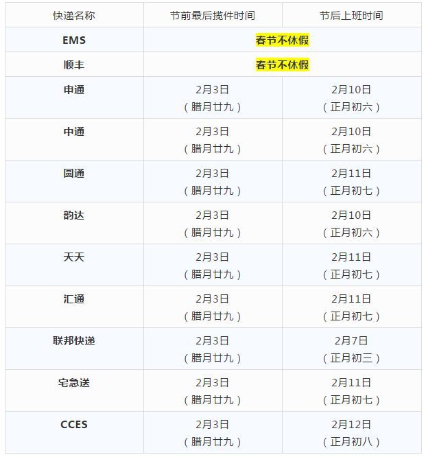 顺丰速运表示,春节期间安排了充足的值班力量,实行24小时值班和轮班机制,保证快件存放安全和承接客户收发件的需求。但需要提醒的是,顺丰当日件将在1月26至2月10日停止收发,次晨航空件停运时间为1月26日至2月19日,次晨干线件则在2月1日至2月10日期间停止收发。