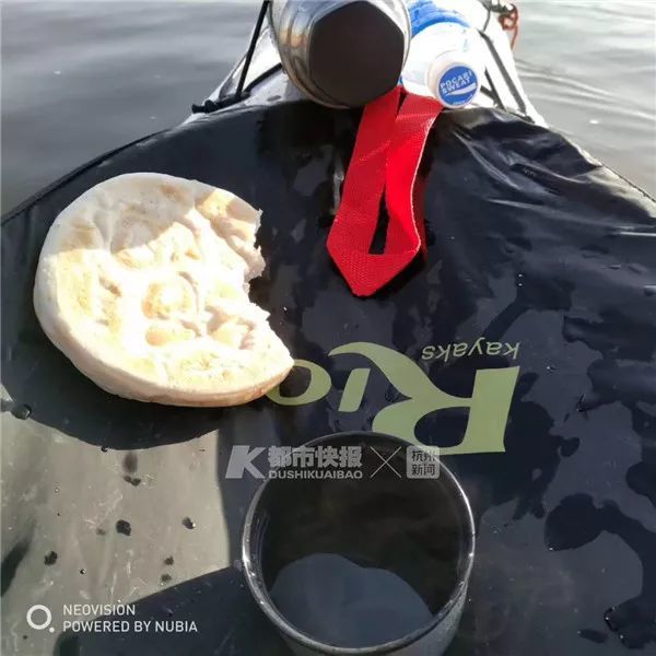 陈文军每天的水上划艇时间大约是上午9:00-下午4:00,为了保证划艇时间和距离,白天他都不上岸,“艇拖上拖下太耗时,再说也不一定有岸能靠。”不上岸就不能上厕所,因此白天他都是少吃少喝,而饼是最合适的食物,“人家问为啥不吃包子。包子里有肉,万一吃坏肚子得上厕所,万一咸了水喝多了还得上厕所。馒头也可以,但是本身没味道,体积又大,吃多了还容易噎着。还是饼好,不占地方,不会吃坏肚子,有甜有咸的,就着温水就行。”