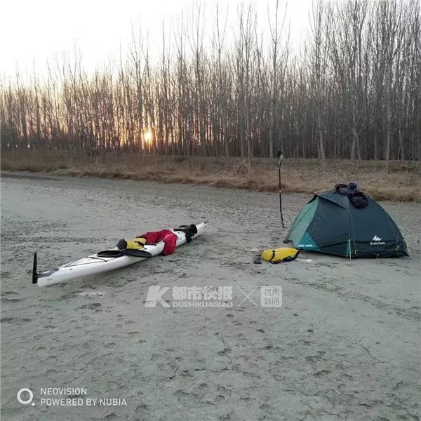 入夜,找不到宾馆旅店的时候,陈文军不得不在野外搭帐篷,由于冬天夜里户外温度太低,宁愿自己挨冻,他也要给艇盖两条睡袋。手机直接冻到关机,就贴暖宝宝恢复下。总之照顾装备比照顾自己更重要。
