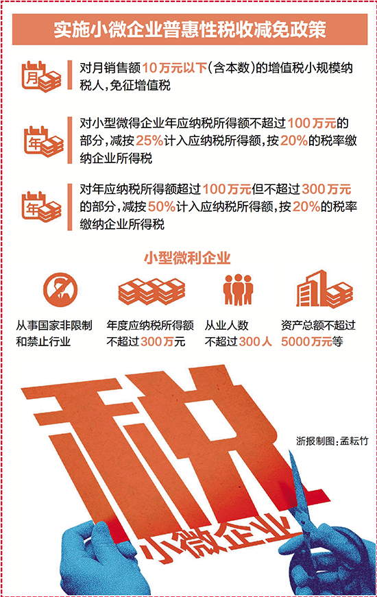 放宽小型微利企业适用标准,年度应纳税所得额、从业人数和资产总额三项指标上限分别提高到300万元、300人、5000万元。
