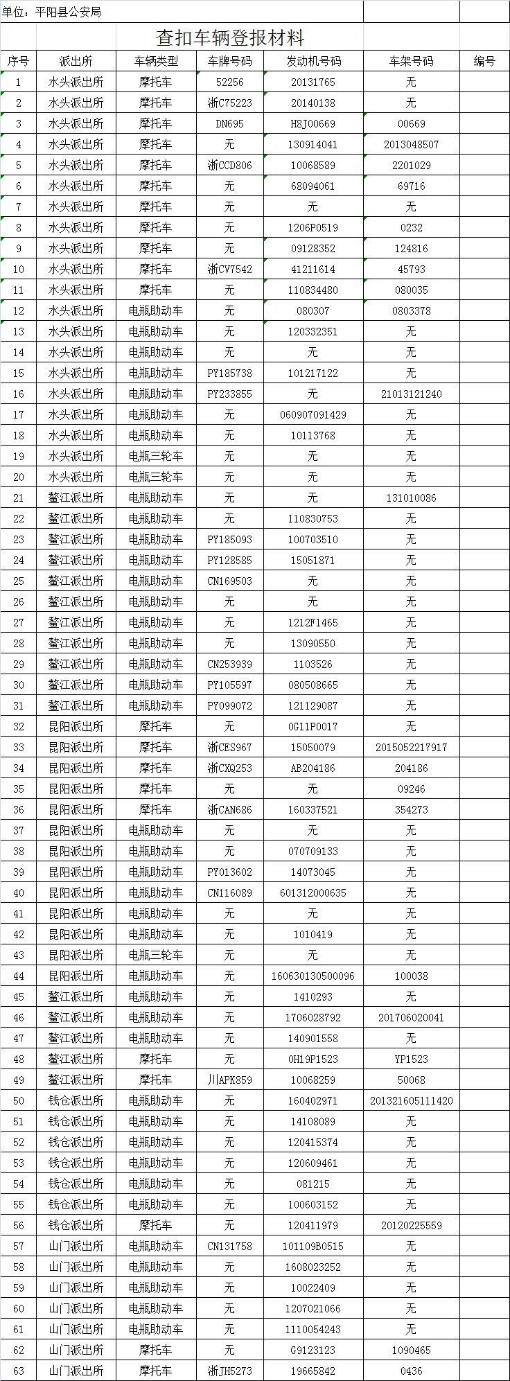 2018年以来,平阳县公安局积极开展打击盗抢违法犯罪活动,查扣无人认领的各类机动车与电瓶车共63辆。根据公安机关涉案财物扣押处理相关法律规定,请各位车主自本公告之日起六个月内(2019年1月30日至2019年7月30日),携带车辆行驶证(或车辆合法证明)和车主有效身份证件,到相关单位办理相关手续后进行认领。逾期不予认领的,公安机关将根据《中华人民共和国物权法》第一百一十三条之规定,作无主车辆上缴国库。扣留车辆的基本信息,请登录到“平阳县公安局”门户网“通知公告”栏查询(http://www.zjpy.gov.cn/art/2019/1/10/art_1412609_29369235.html)