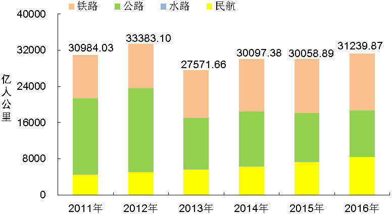 笔者的这种观点也能得到数据的支撑,根据《2016年交通运输行业发展统计公报》中对几种交通方式旅客周转量的对比,我们不难清晰地看出中国铁路的客运周转量是靠与公路运输竞争中争取过来的。虽然在下图中民航的客运周转量是一直在上升的,但是我们都知道选择民航出行的旅客和区间一般是不会同时和公路发生交集的。