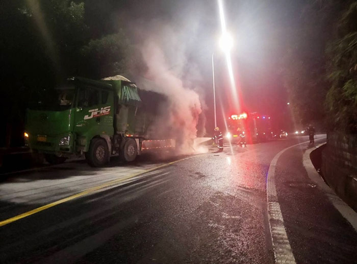 日前凌晨2时许,苍南交警桥墩中队接到群众报警称104国道分水关路段关庙村路段有一辆工程车突然冒烟起火,民警立即赶赴现场,对现场交通进行临时管制并实施灭火。经过消防10多分钟的努力最终扑灭了该车的火势,避免了二次事故的发生。