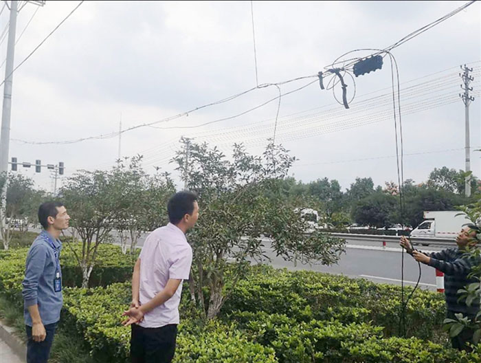 通福路位于104国道线,车流量、人流量大。县综合行政执法局指挥中心在日常巡查中发现,该路段架空线路存在低挂、掉落现象,部分线路交接箱直接掉落在绿化带上,各种电线纵横交错像空中的“蜘蛛网”。发现该现象之后,指挥中心立即函告各通信公司采用分段整治的方式,在限定时间内处置。同时,积极组织各通信公司维护人员到现场查看确定整治范围和整治要求。
