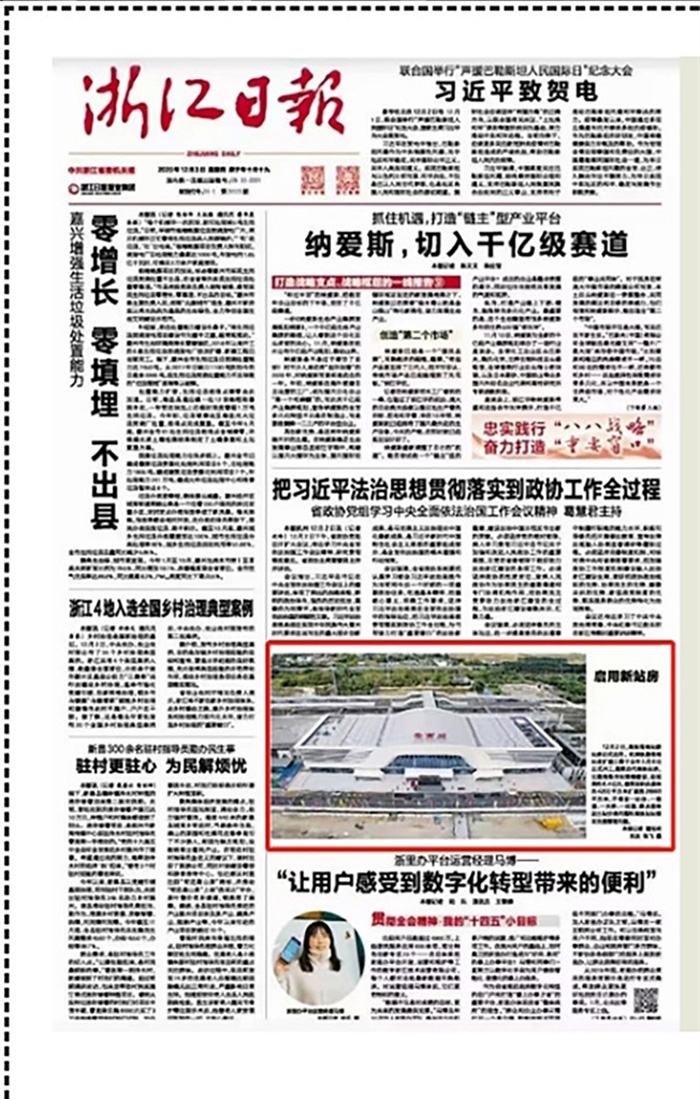 “12月2日,位于浙江省苍南县县城新区的杭深铁路苍南高铁站改扩建新站房正式启用,建筑面积扩建到26993平方米。”12月3日,新华每日电讯在头版报眼位置刊登了新华社记者黄宗治的图片新闻报道。同日,《人民日报》《浙江日报》也在头版明显位置分别刊发了《杭深铁路苍南站新站房正式启用》《启用新站房》的图片新闻报道,中央电视台在今天的新闻直播间也对新站房启用作出新闻播报。据统计,这两天,报道新站房启用的媒体还有央视网、中国政府网、中国新闻网、中国网、经济日报、温州发布、温州新闻、苍南发布等十几家媒体。