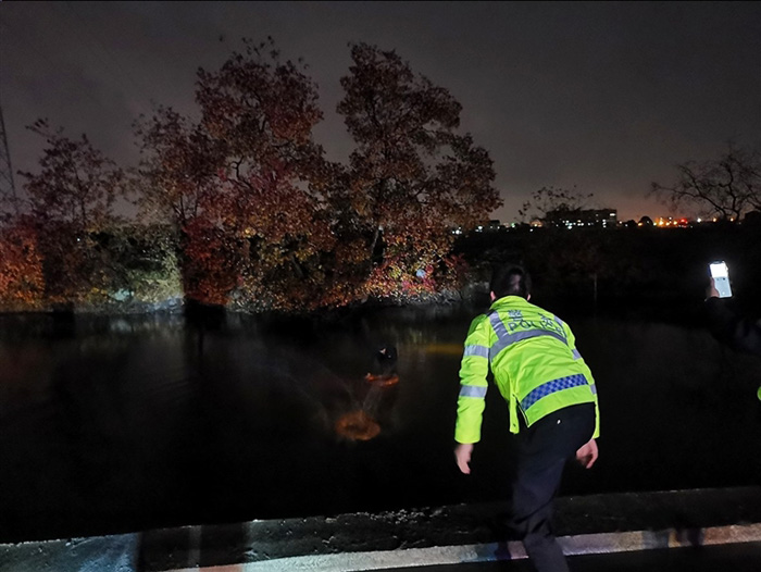 民警包邦跑带队3分钟内赶赴现场,发现驾驶员周某已自行爬出驾驶室,踩在车顶,不停呼救。此时,气温接近零度,驾驶员半个身子浸泡在水中,车子还在不断下沉,情况十分危急。包邦跑马上从车上拿出救生圈、救生绳往河边跑,站定位置后,将救生圈抛掷周某身边,然后与同事一起将还在下沉的周某拉上岸。周某上岸之后,包邦跑看到他冻得瑟瑟发抖,连忙脱下警服给他披上。