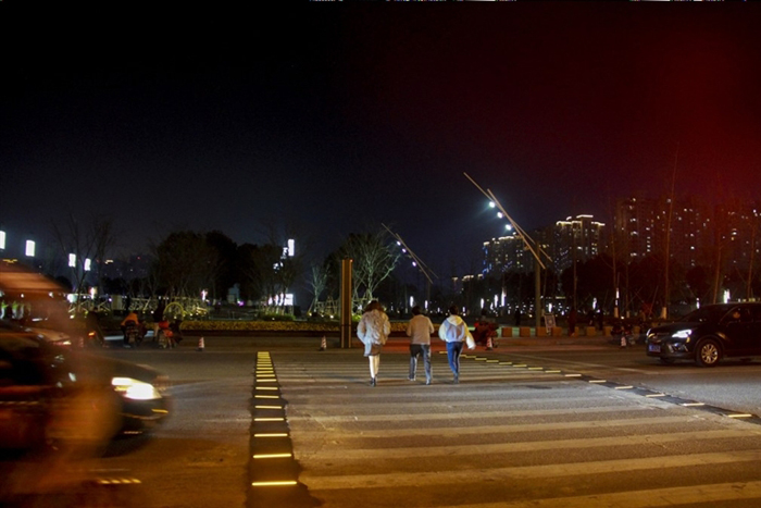 当晚,记者在人民大道苍南行政中心西侧大门口看到,一条会发光的人行横道分外醒目。该条“智慧斑马线”由四部分组成,分别是路面地砖灯、人行感应射灯、猫眼道钉和电子显示屏。人行感应射灯检测到有行人通过及进入斑马线感应区域时,斑马线两侧的地灯就会自动亮起,并跟随行人滚动闪烁。当行人安全通过斑马线区域后,地灯随即自动熄灭。同时,斑马线两头还立有LED显示屏,当行人过马路时,会以语音播报形式提醒行人注意来往车辆,快速安全通行;也会以LED字幕形式提醒几十米开外的机动车减速慢行。记者观察到,在闪闪发光的斑马线前,不少机动车辆“减速、刹车、礼让”一气呵成,文明礼让效果显著。