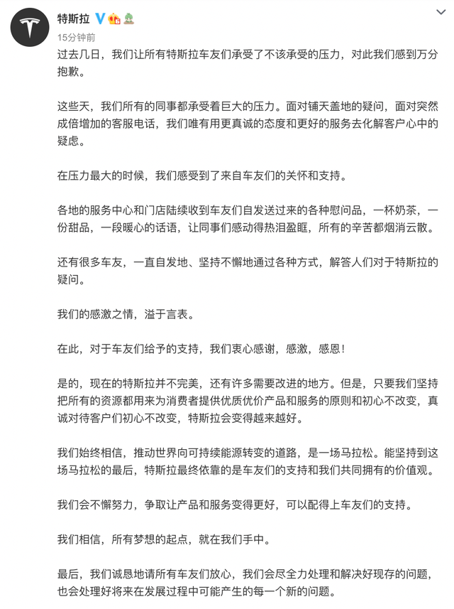 过去几日,我们让所有特斯拉车友们承受了不该承受的压力,对此我们感到万分抱歉。