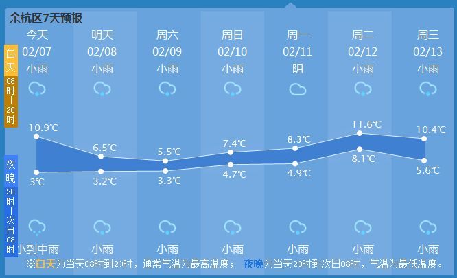 据余杭气象台:今天白天阴有小雨,夜里阴有小到中雨;明天、后天阴有小雨。偏北风5-6级阵风7-8级。今天白天最高气温11度,明天早晨最低气温3度。