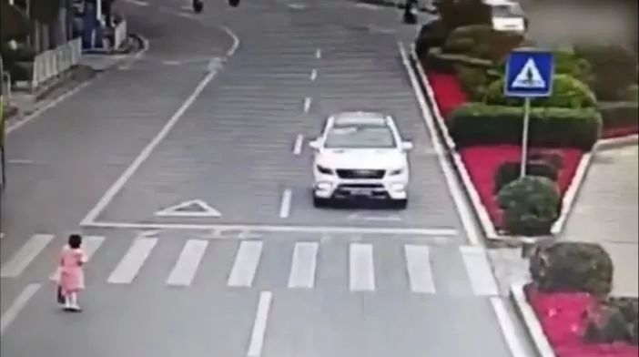 春节期间,广东潮州,回家过年的林先生开车时,一个小女孩正准备经过人行道。小女孩看到车驶过来,停下了脚步,林先生也随即减速、停车,礼让小女孩先过。