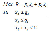 但这里有一个问题:一个航班的座位数是有限的,怎样给有不同价格上限的消费者做销售分配?即不同价格的票分别划分出多少张来卖才合适?pb和pe。航空公司拟定向这两类消费者出售的机票数量分别是xb和xe。由此产生的总收入就是: