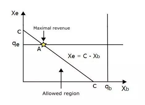 因为飞机上座位的数量都是有限的,所以收入有约束条件:首先两种不同价格的机票数加起来不能超过飞机总座位数 C,即xb+xe≤ C;其次航空公司也会为两种价格的机票数量各自划定上限,低价票的数量应当不超过市场上对低价票有需求的消费者总数量qb,即xb≤qb,类似的,高价票的数量也应当不超过市场上高价票有需求的消费者总数量qe,即xe≤qe。由此们就可以把航空公司收益最大化问题转化为一个简单的线性规划问题: