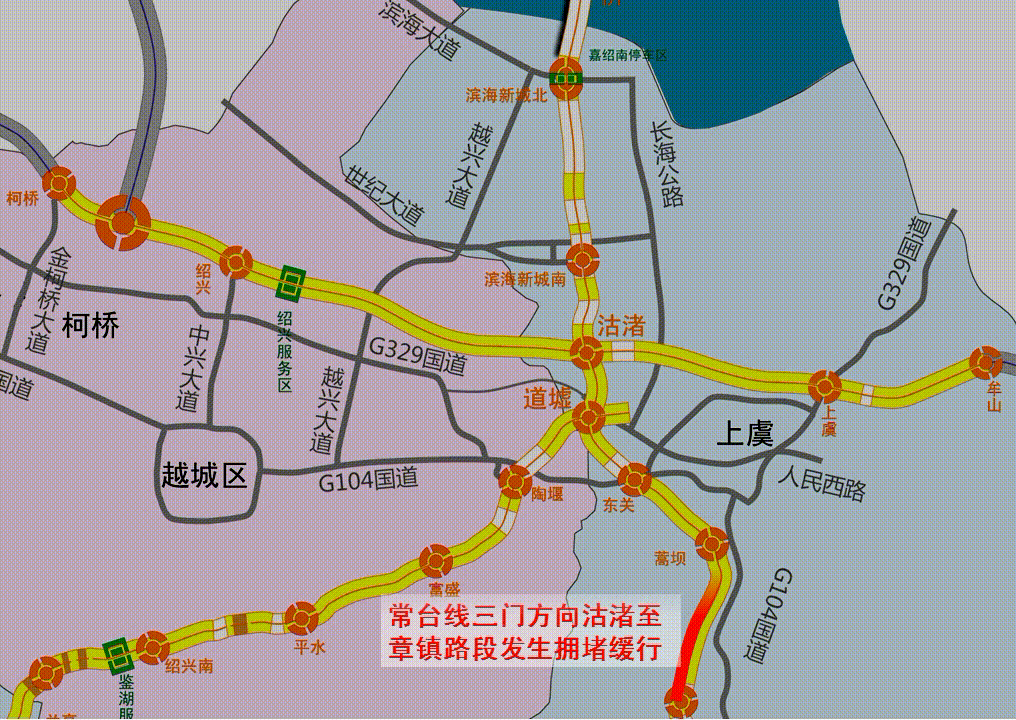 杭甬高速沽渚枢纽、常台高速沽渚至章镇拥堵缓行时,去往绍兴、柯桥、上虞等地详细绕行示意图