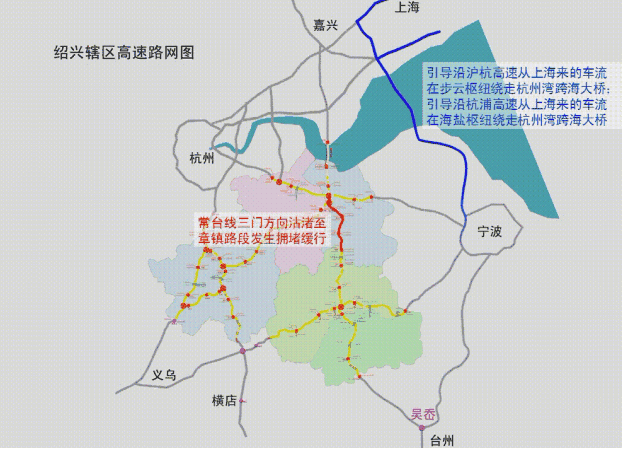 常台高速三门方向沽渚至章镇、马岙岭隧道拥堵缓行时、杭甬高速宁波方向和嘉绍南连接线台州方向沽渚枢纽拥堵缓行时、杭金衢高速杭州方向拥堵缓行时绕行示意图