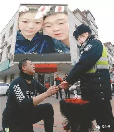 2月14日,记者在南五马路十字路口附近的人行道上见证了浪漫的一幕:一名男交警手捧鲜花走到刚刚下岗休息的一名女交警面前,单膝跪地,向她献上鲜花和钻戒当场求婚。