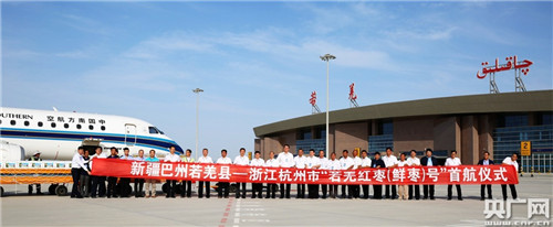 当天下午17时30分,“若羌红枣号”航空货运专班首发仪式在楼兰机场停机坪举行,首批3吨优质若羌冬枣被陆续搬上飞机行李舱,经乌鲁木齐发往浙江杭州市,标志着若羌红枣实现了从田间到东部沿海城市市民舌尖的“零距离”。