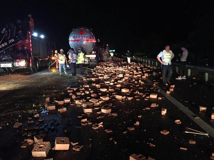 9月21日晚上22时许,S33龙丽温高速丽水方向75KM+200M处(北界收费站附近),一辆油罐车追尾碰撞一辆重型货车,导致货车所载的红砖洒落一地,占据约30多米的主车道及部分慢车道,造成该路段交通受阻,同时油罐车驾驶员因驾驶室变形,腿部被卡住无法动弹,情况十分危急。