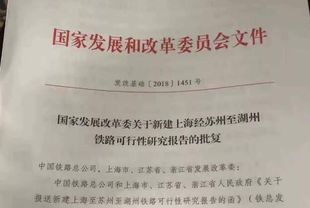 10月9日,国家发展改革委批复新建上海经苏州至湖州铁路可行性研究报告,同意建设沪苏湖铁路。相关批复同意文件10日已下发沿线省市发改委。