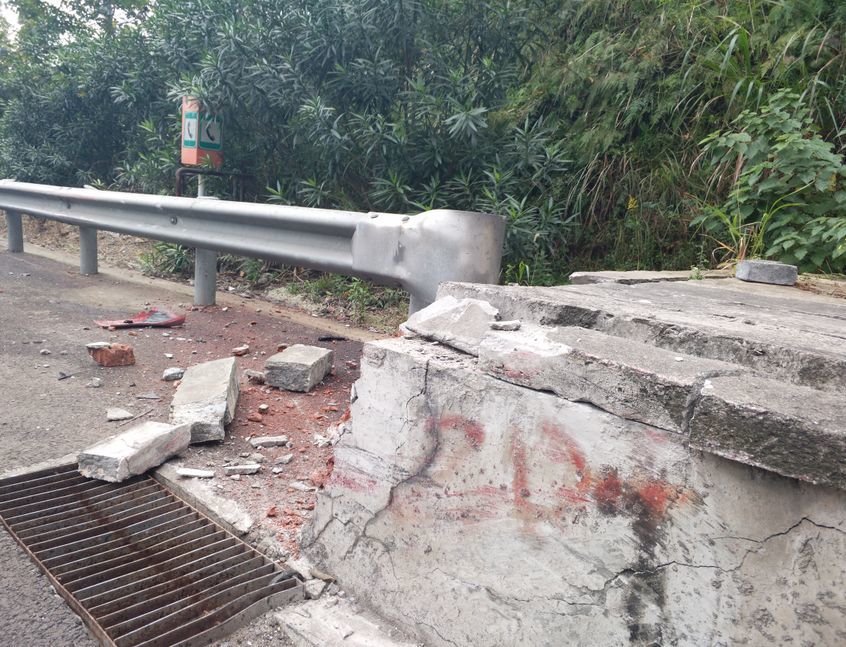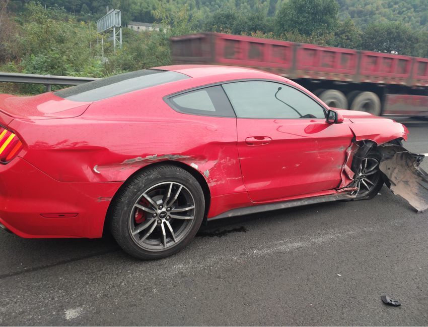 民警赶到现场时发现,一辆红色的小车停在车道上,远处还有一辆黑色小车停在应急车道上。经过现场查看,红色小车前部受损严重,右侧有明显刮擦痕迹,右前轮胎爆胎,远处的黑色小车后部受损严重,隧道出口的水泥护栏也被撞坏了,现场还散落了不少汽车零件碎片。