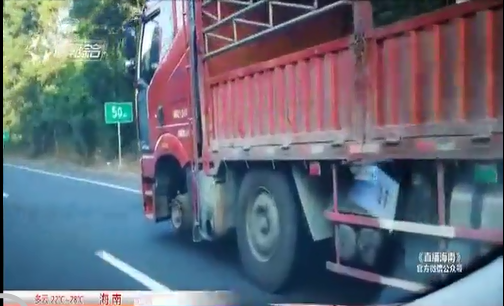 南省交警总队,而在跟随一段时间后,记者又再次惊讶的发现,这辆大货车可以说是不仅没有左前轮。右前轮也没有,就这样,卡车一路从洋浦出口下了高速,向白马井方向驶去。