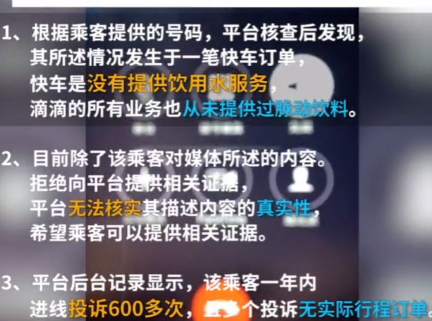 不过何先生还是找上滴滴出行投诉司机,要求索赔,不过遭到了拒绝。随后何先生就联系上媒体将自己的遭遇曝光了。联系上滴滴客服时,滴滴客服表示男子当时乘坐的车辆并非滴滴专车,而是滴滴快车,一方面是滴滴快车本来就没有提供饮料的服务,并且滴滴专车也不会提供脉动这种饮料,滴滴提供了一份清单,表示何先生在一年之内投诉高达六百多次,其中大多数都是没有乘坐记录的。让何先生提供证据,何先生则拒绝提供。